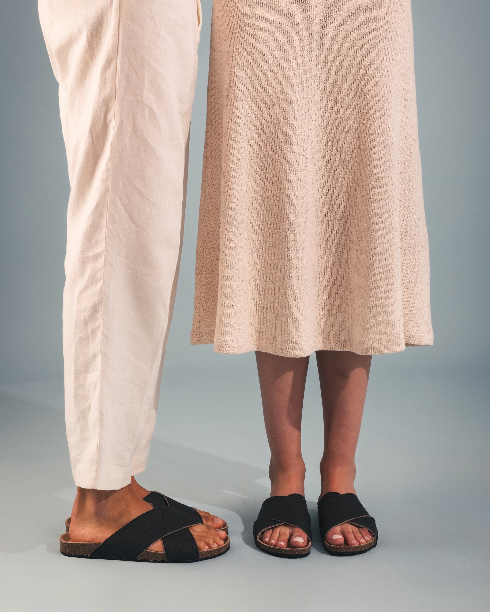 Die schwarzen veganen Sandalen von Tupai zeichnen sich durch ein kühnes, kreuz und quer verlaufendes Design aus Piñatex aus. Die Riemen sind 5,5 cm breit. Das anatomisch geformte Korkfußbett sorgt für außergewöhnlichen Komfort, während die robuste Sohle aus recycelten Autoreifen eine umweltfreundliche Haltbarkeit garantiert. Diese Sandalen sind perfekt für modebewusste Menschen, die eine stilvolle und nachhaltige Option suchen.
