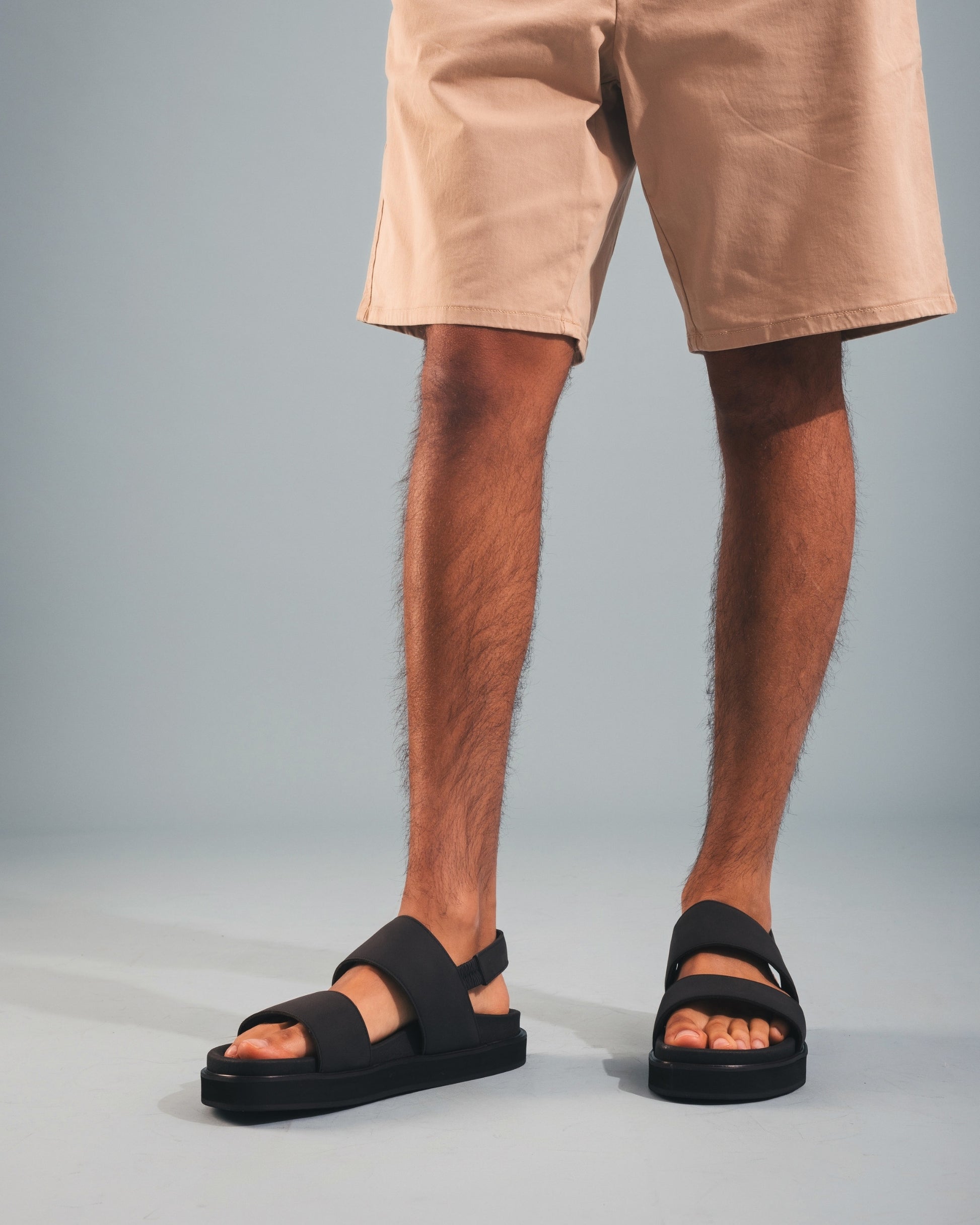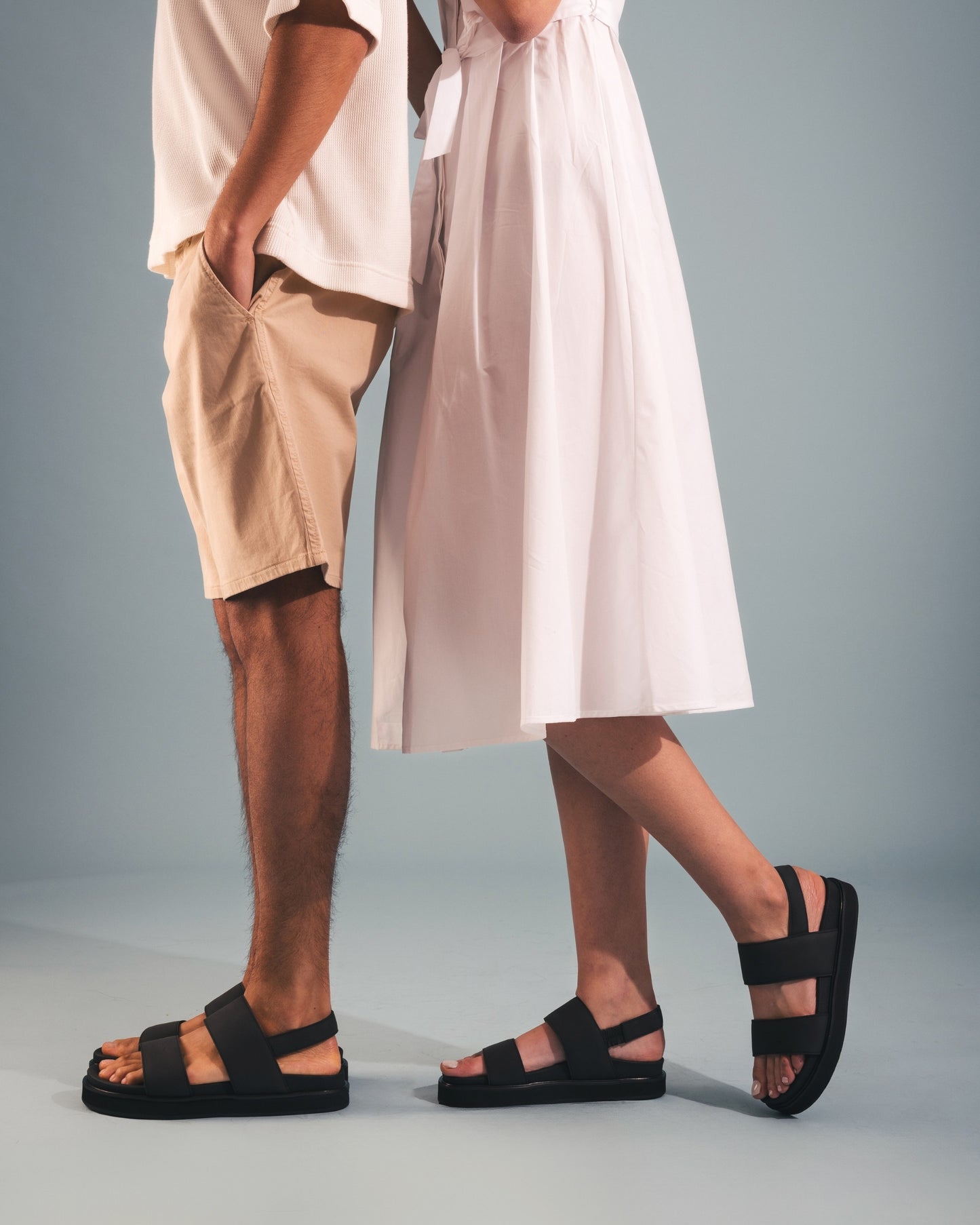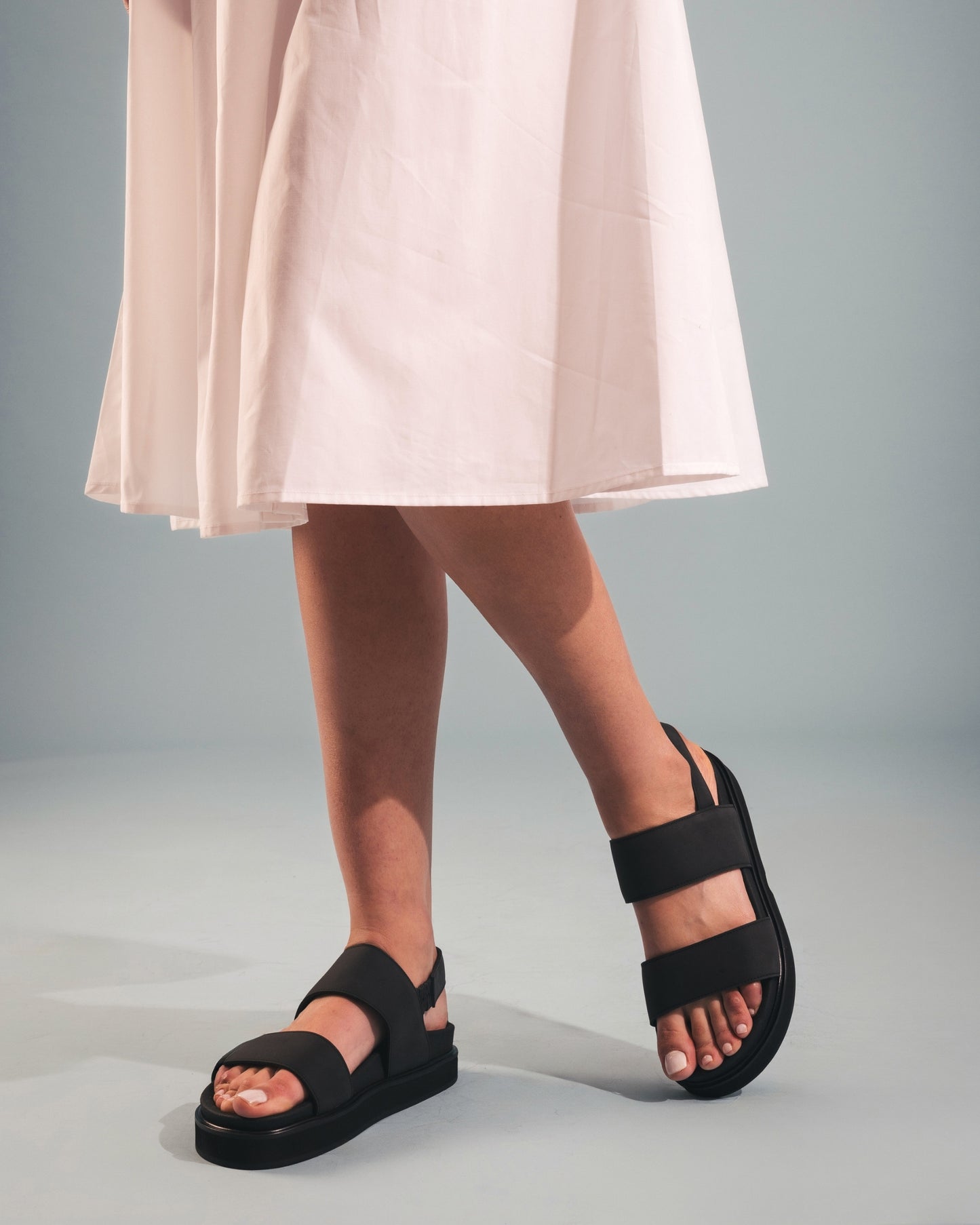 Lau Black vegan sandals are handcrafted in Portugal with eco-friendly microfibers. Featuring a 2 cm platform, two parallel straps (front strap: 3.5 cm, second strap: 4.5 cm), and a 2 cm heel strap for a secure fit, these slip-ons offer a bold, contemporary style. Perfect for sustainable wardrobes seeking comfort and versatility.
