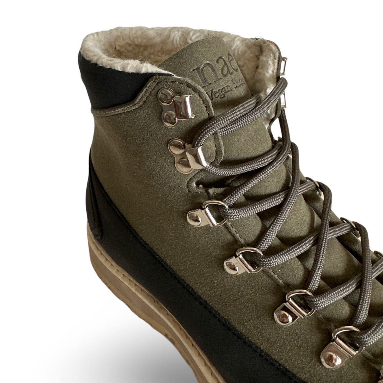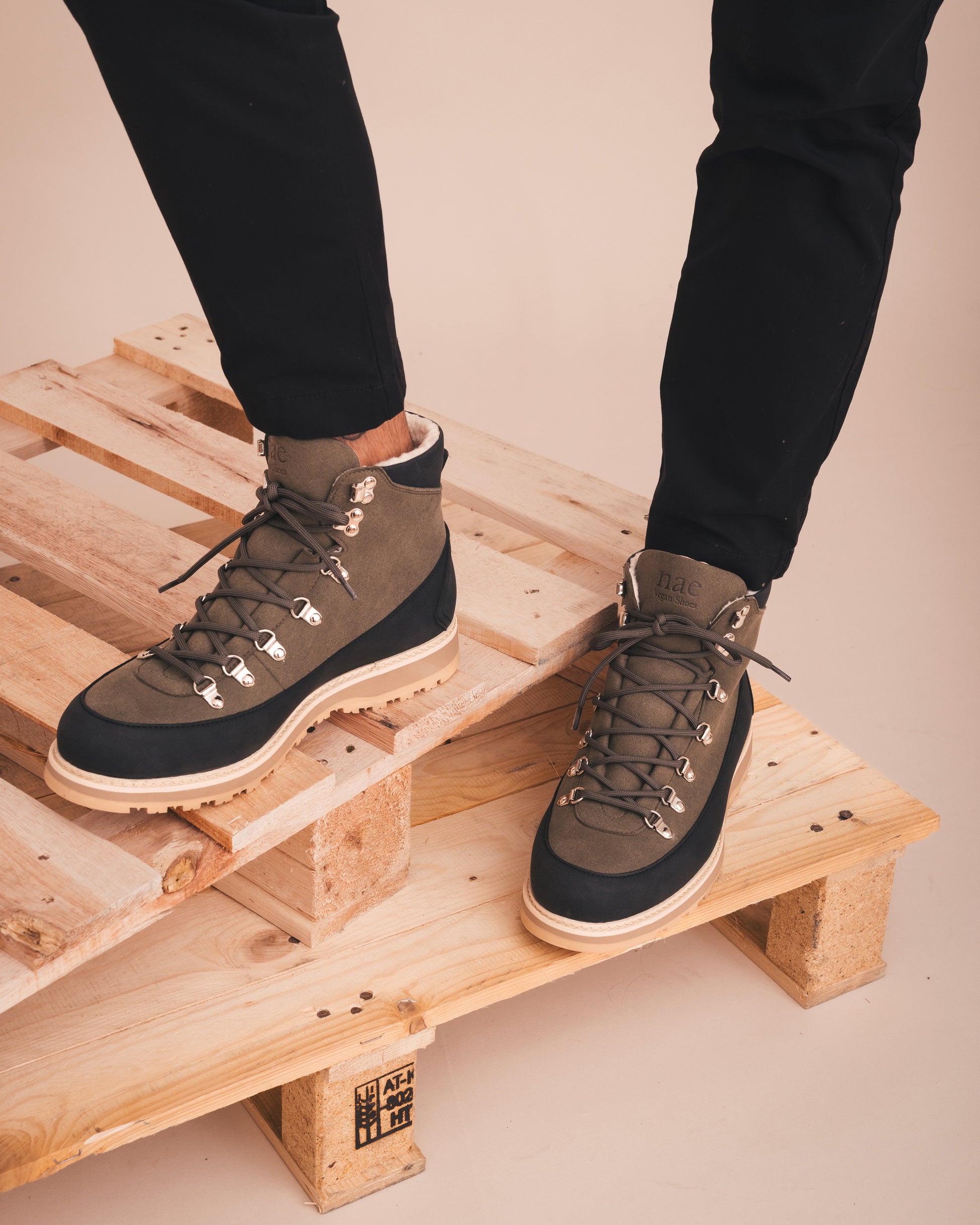 Neru is a men's vegan boot designed for warmth, comfort, and durability. Made in Portugal from vegan suede and vegan nubuck, it features a hiking-inspired silhouette and a plush organic cotton lining. Ideal for winter wear, with sturdy metal eyelets and a robust sole for traction and support.