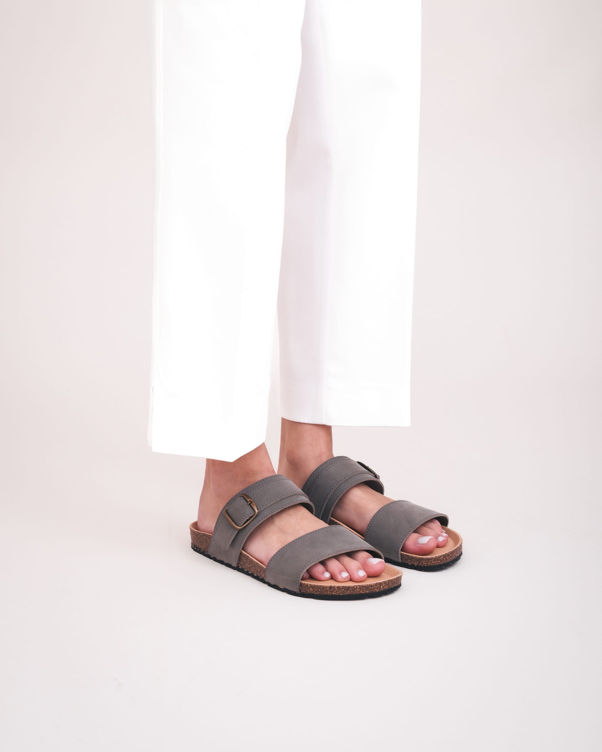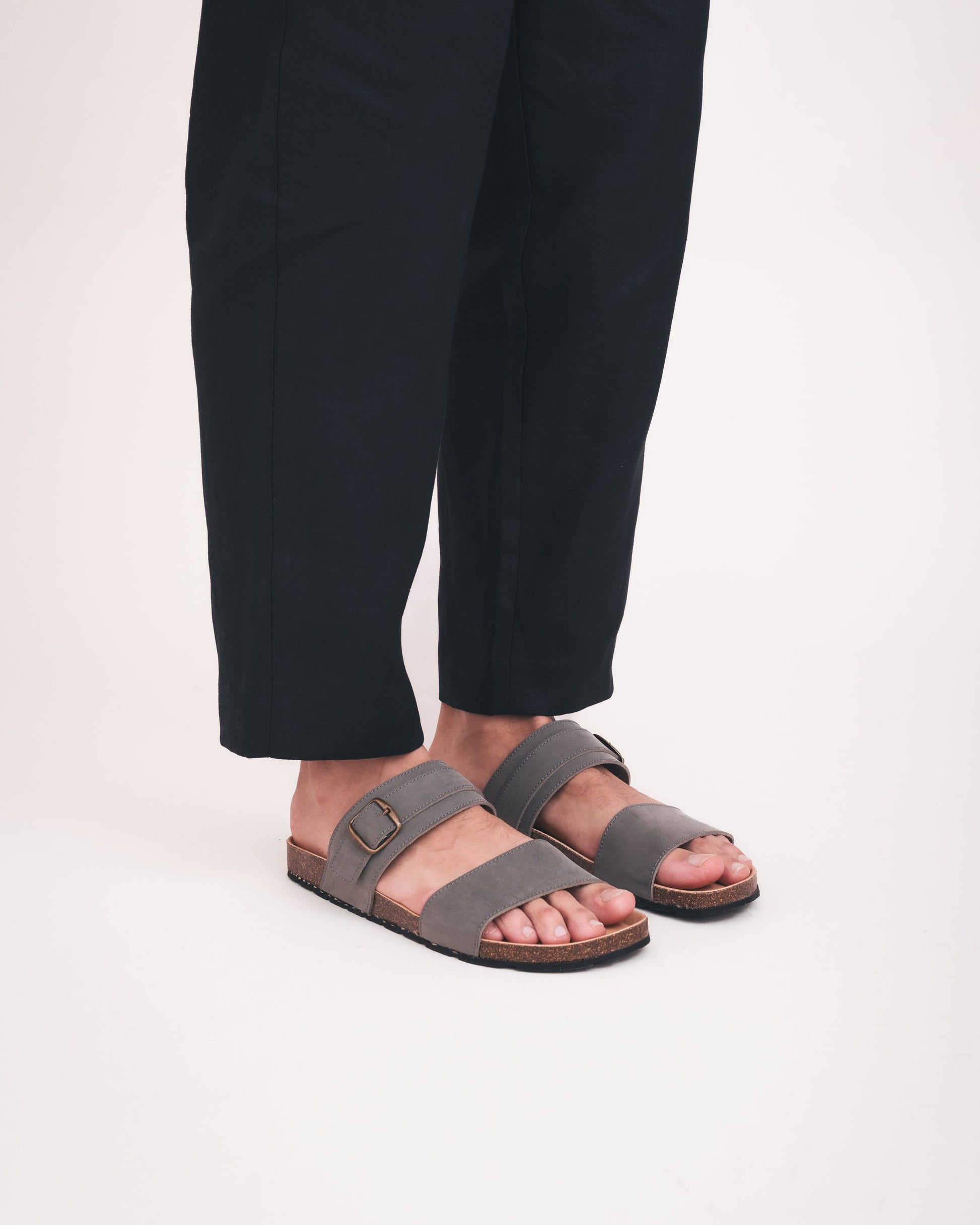 Minimalistische vegan sandaal met vaste banden en kurken binnenzool.