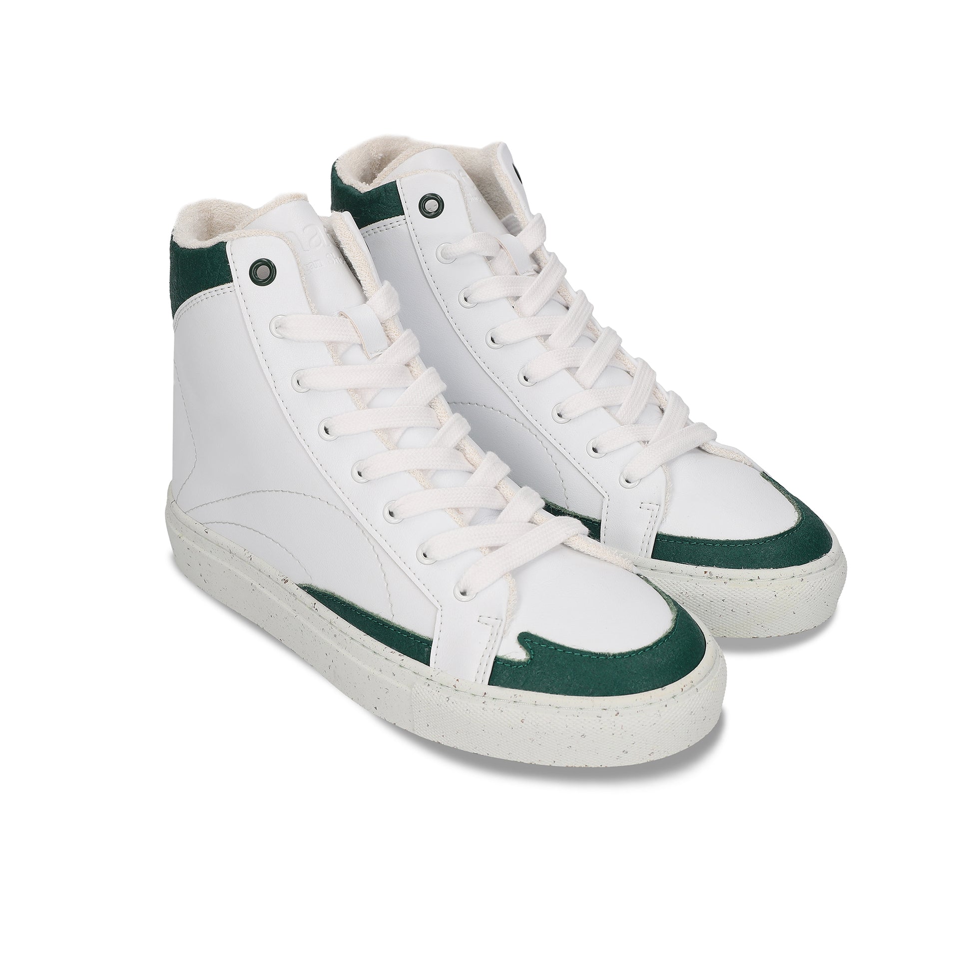 We present you the London Green High Top Sneakers, with a white base color and green detail, made of recycled materials. These vegan shoes are crafted from sustainable, innovative, durable, and cruelty-free materials, offering a stylish, comfortable, and eco-friendly choice for any wardrobe.